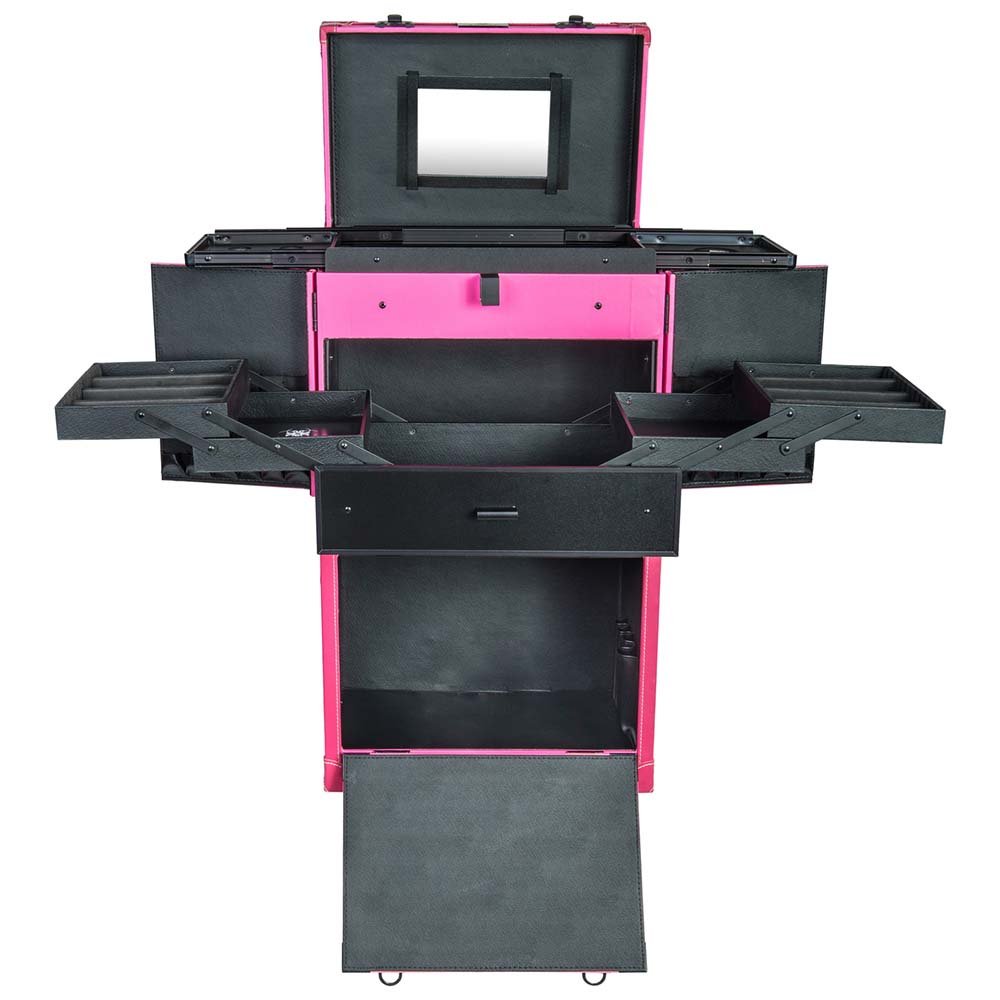 SHANY Rebel Alpha Pro make up case is the most convenient as far as the size and functions. SHANY Rebel cases are modern and sleek. The Alpha version comes with a large top compartment were you can easily place your favorite makeup brushes and other easy access tools. It converts itself to a free-standing portable makeup station with a mirror, drawers, and tiered trays for storing your supplies while staying organized. The exterior is made of heavy duty leather match and aluminum frames which adds a very sharp appearance on the stage. The extendable large and small compartments in the middle portion area are adjustable and will fit almost any size beauty supplies. Rebel Alpha case includes bottom lockable wheels for easy rolling and converting into a free-standing make up station. The Rebel Alpha cases are great for medium to full stage applications. Based on industry standards the Rebel Alpha cases are considered medium size trolley cases, which are airport friendly with majority of airlines, and also can be carried around easily due to their light weight.
