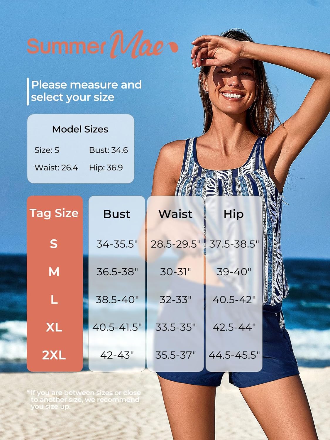 Review: It is really hard to buy something online that will fit right. I am a size 40 in the bust and wear a size 12. I ordered an XL. The top has an inside bra that fits snuggly. And the bottom of the top comes in so that it won’t reveal when diving. The boy shorts fit really well too. I absolutely love the zippered pockets. This quality of the material used is really good. I’d have no problem buying another Summer Mae Blouson Tankini.