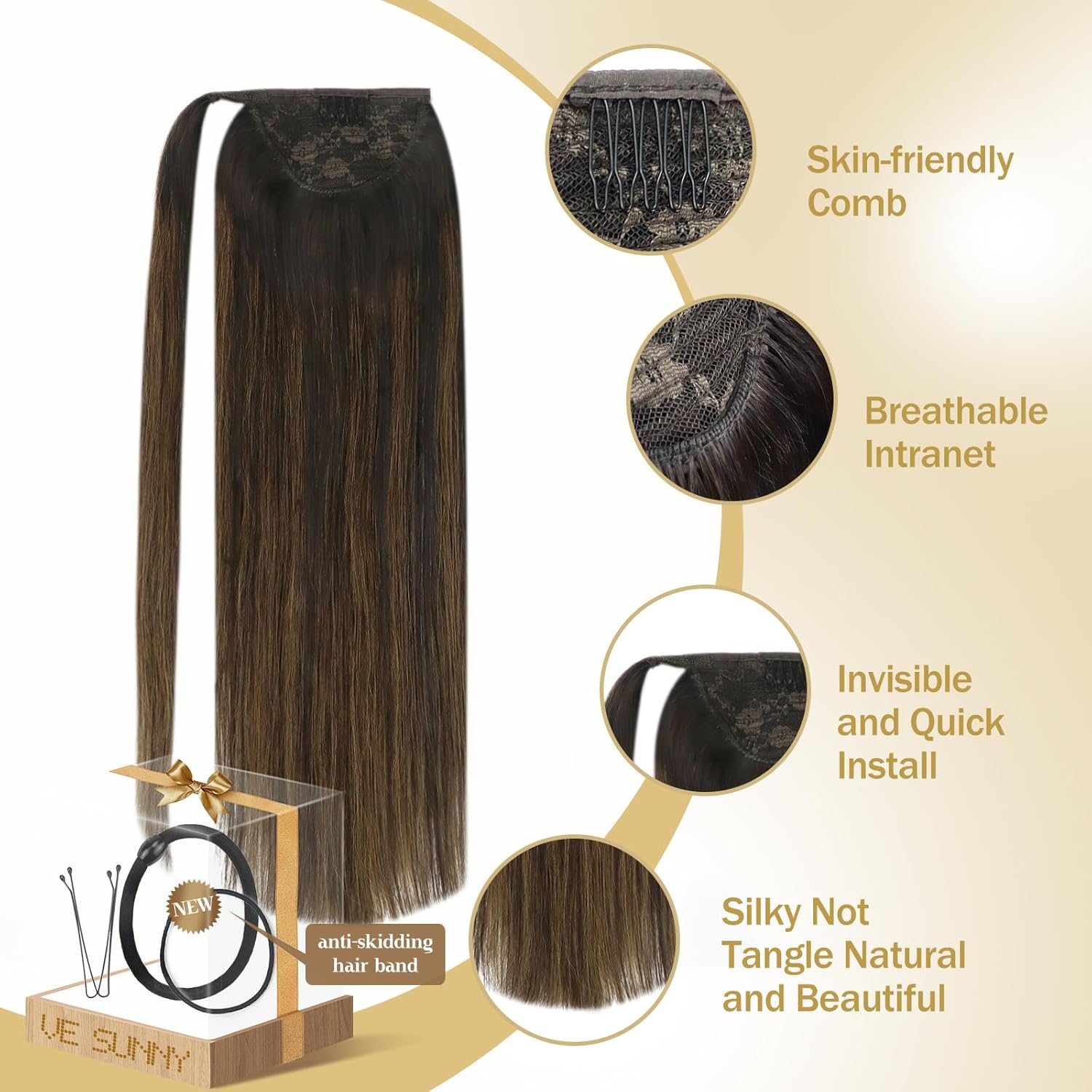 Real Human Hair:Ve Sunny Ponytail Extension uses high-end real human hair, retains natural cuticles, has real-like texture/luster with “smooth, subtle resistance” , and is reusable, washable, and compatible with dyeing, straightening and curling.