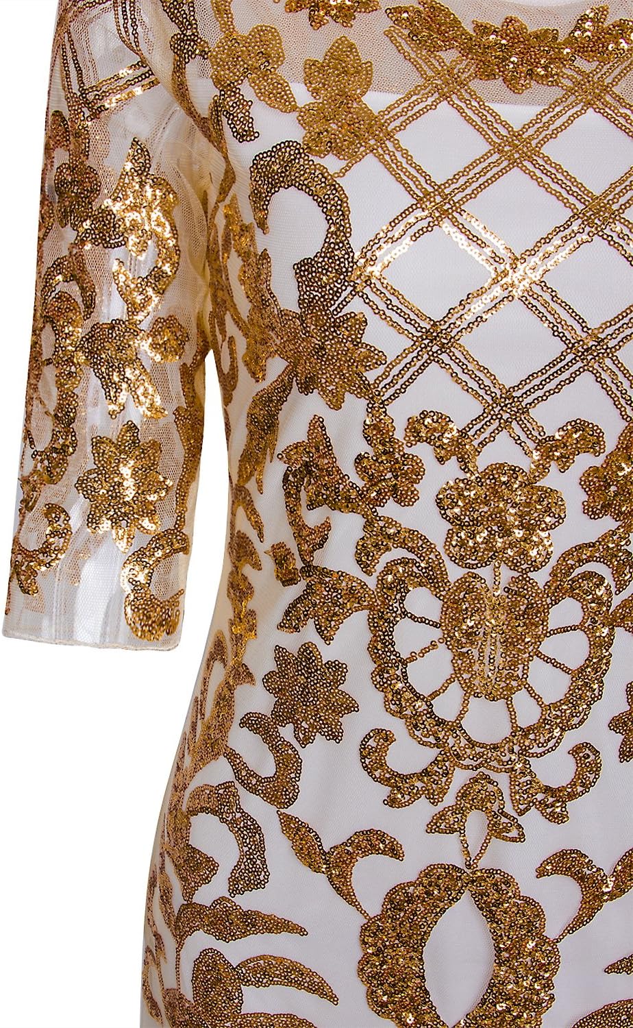 This is an elgeant 1920s long prom dress,Formal Mother of The Bride/Groom Outfits Evening Wedding Dresses with 3/4 Sleeves, Perfect for bridesmaid, mother of bride, evening party, wedding, Homecoming, prom or any formal occasion, fishtail Banquet Evening gown,A skinny fabric,stretchy,fit perfectly and feel comfortable for this formal gown.The Mermaid mesh hemline,The dress with crewneck,deco with sequins makes to paisley and flashing sparkly in the spotlight.The dazzling pattern catch everyone’s eyes.The back has the same splendid pattern as the front shows,a concealed zipper hide the side of the dress,wrap up your perfect figure.The trumpet bottom part is light mesh fabric,you can dance or walk briskly.Enjoy your great wedding party/special occasion/roaring 20s with this sequin art deco gatsby long ball gown.
