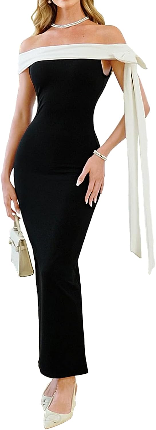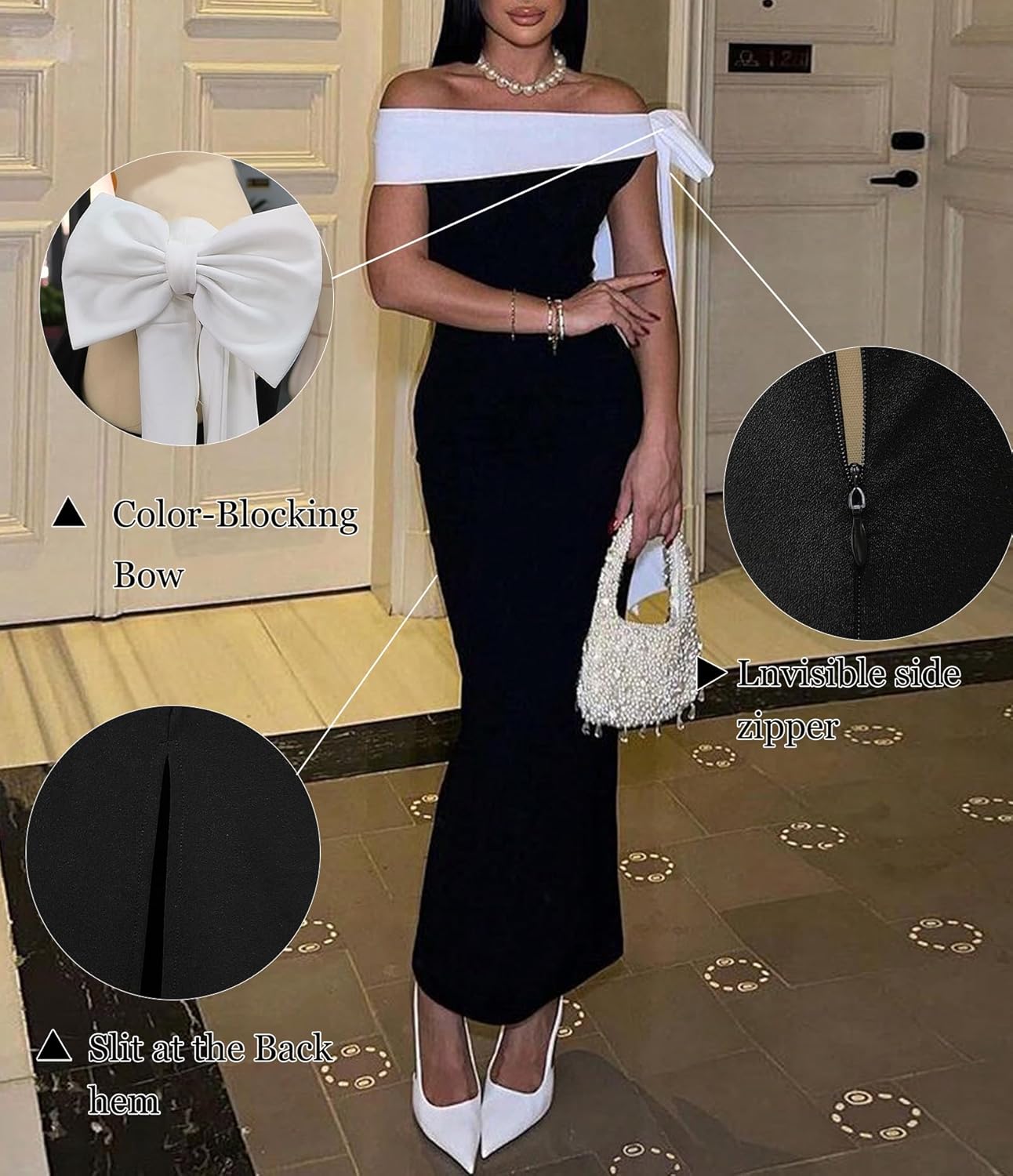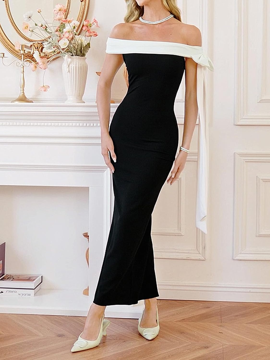 Features: bow ribbon, off shoulder, backless, colorblock, hidden side zipper, back slit!!