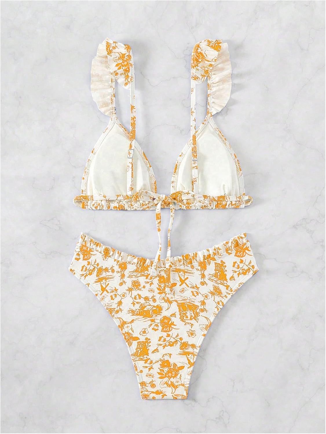 Review: This is certainly a cute bikini (and the cut of the bottoms is much more flattering than full cover). I ordered this in a medium even though I’m normally a small (2-4) and medium WAS the correct size for this one. I’m not as crazy about the top just because string bikini/triangle tops aren’t the most flattering on my smaller chest, but the frills on this top make it much more feminine and flattering. In any case, $26 is slightly overpriced for this set.