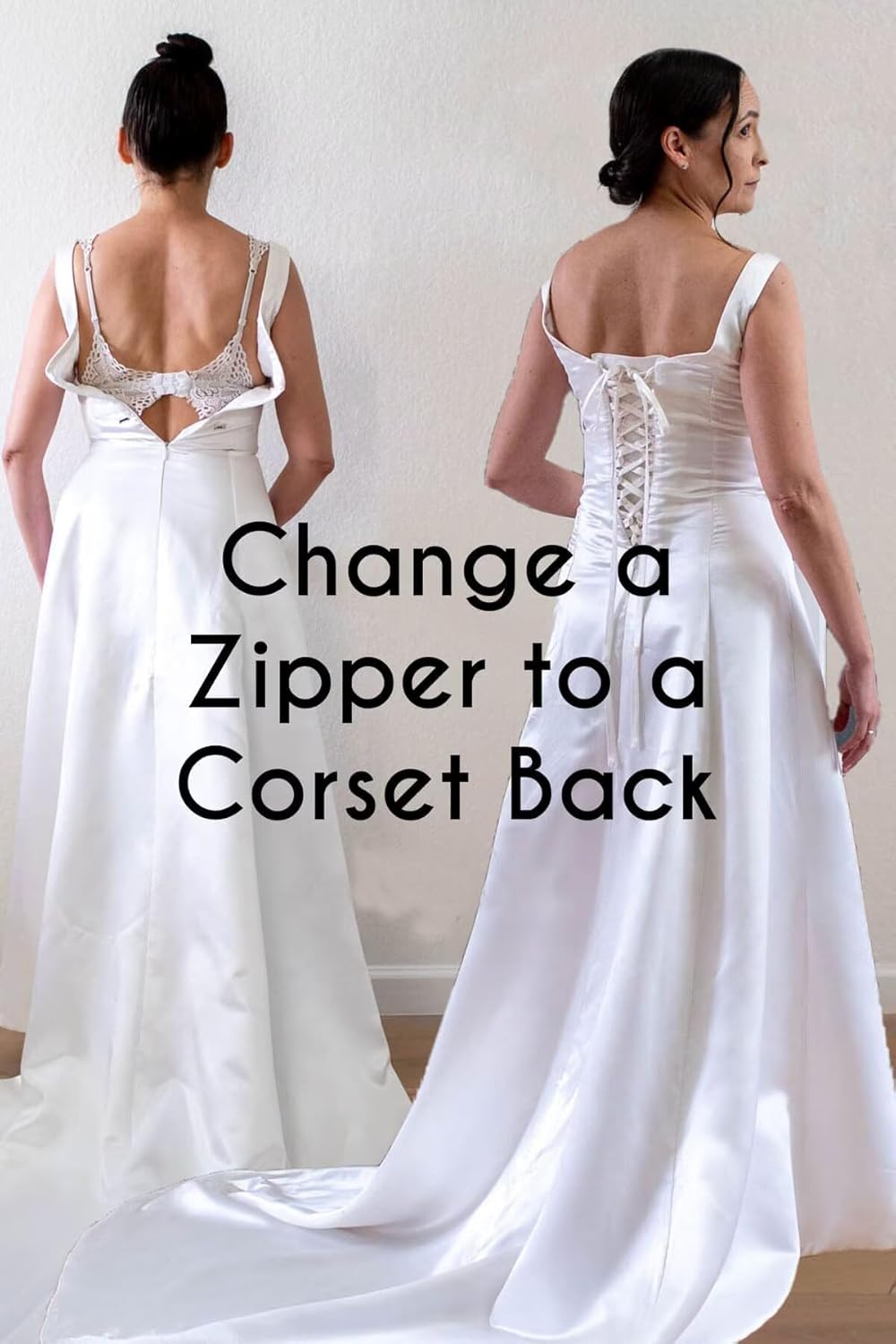 3 pieces (2 loops and 1 satin ribbon ties), replaces zipper or buttons in your gown with an adjustable lace-up corset.