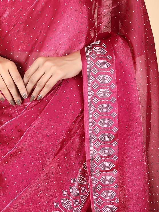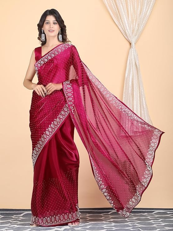 Transform any Occasion into a Grand Velebration with the exquisite. This Silk fabric Saree adorned with Swarovski Stone Work, designed exclusively for Women. This stunning Saree in maroon exudes elegance and luxury, making it the perfect choice for Weddings, Parties, and Festive Gatherings. Crafted with meticulous attention to detail, it promises a blend of Traditional charm and contemporary style. Elevate your wardrobe with this timeless piece that captures attention and admiration wherever you go.