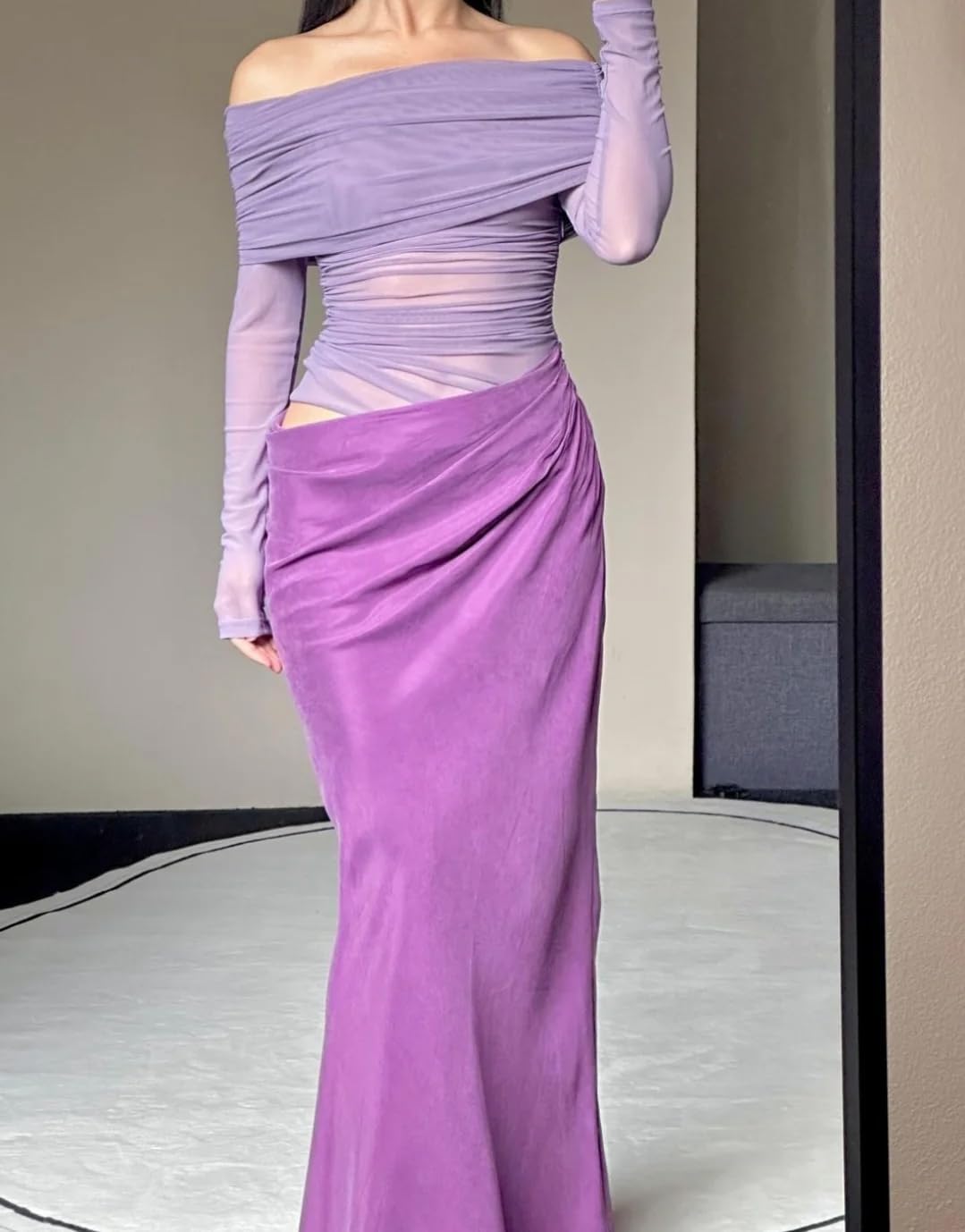 Elegant Women’s Off-Shoulder Sheer Mesh Maxi Dress for Parties & Weddings