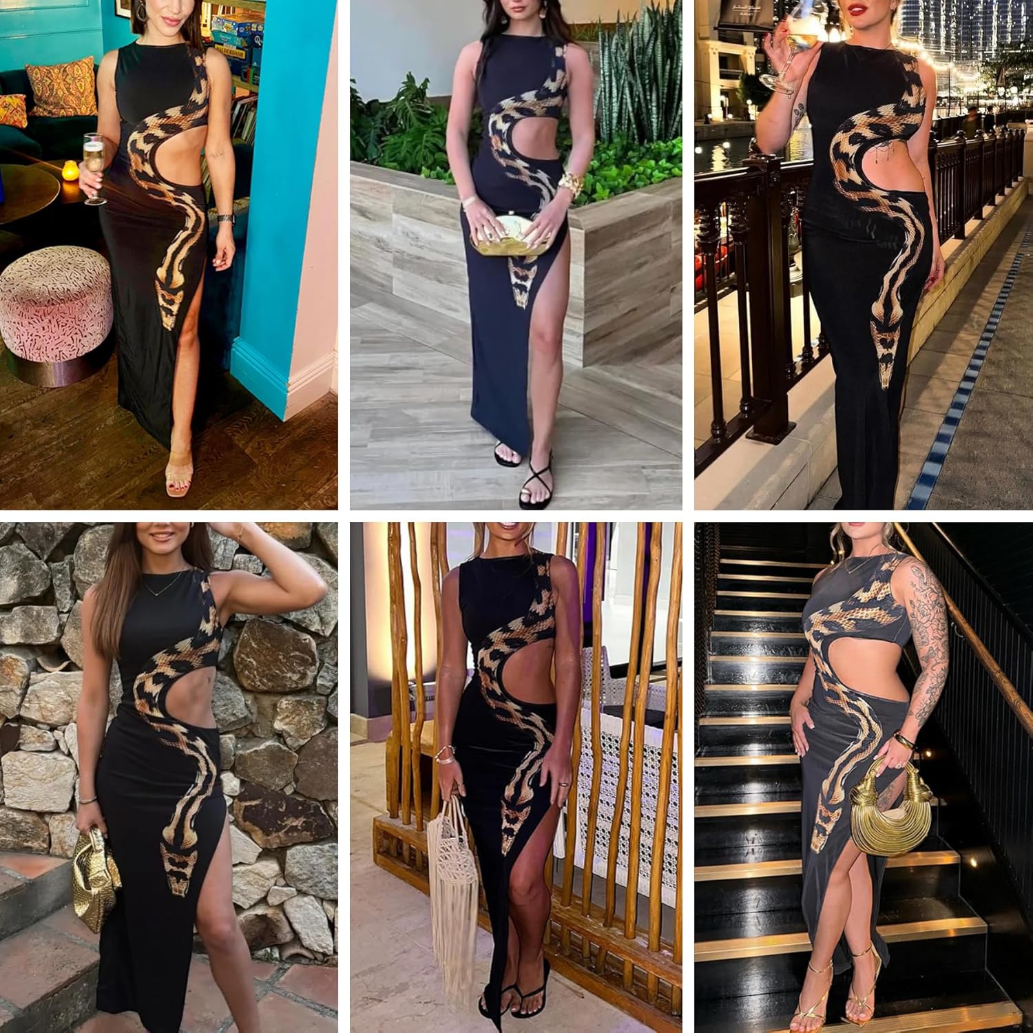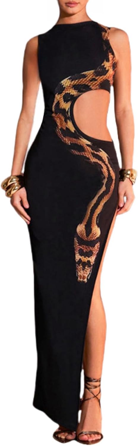 Caviotess Women’s Sleeveless Snakeskin Print Maxi Dress Sexy Hollow Out High Slit Bodycon Long Dress Evening Gown Cocktail Party Dress