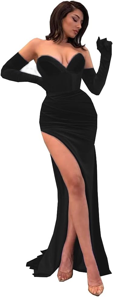 Meicuhap Women’s Velvet Mermaid High Slit Prom Dresses Long Strapless Party Gowns with Gloves