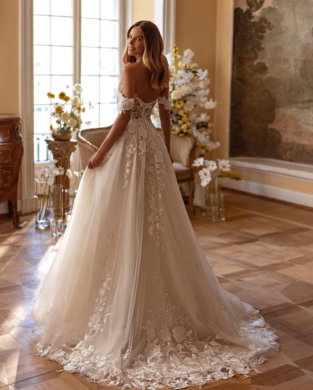 Off Shoulder Tulle Wedding Dresses for Women Lace Bride Ball Gowns